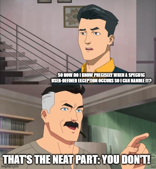 The reason nobody knows is that there is no truly enforceable contract for exception handling in OutSystems. While this may be surprising to you, understand that it is not at all a design flaw in OutSystems itself, and likely it was not even a design consideration because OutSystems apps are all built on the back of C#. Unlike Java, C# does not have a compiler-time check for exception handling enforcement. Java requires that the invoker of a method with exceptions defined in the throws signature must have said method in a try-catch block to explicitly handle those exceptions or some common ancestor type for those exceptions. C# was explicitly designed not to require this. This is called checked (like Java) exceptions vs unchecked (like C#) exceptions [1].